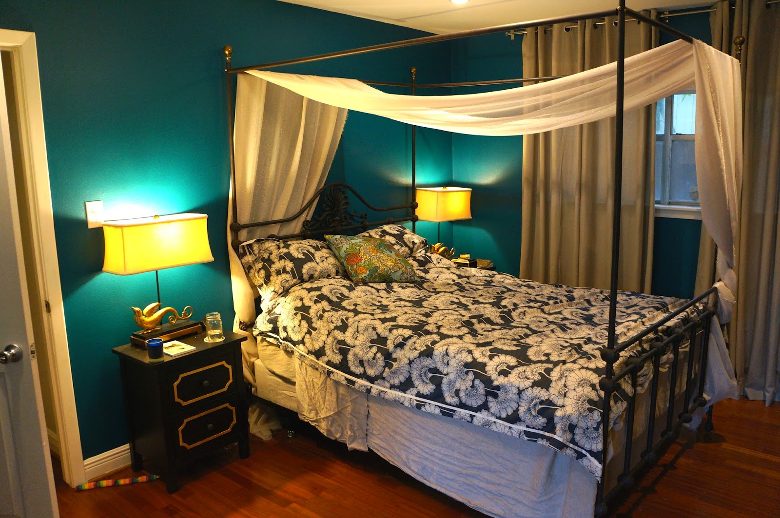 I found a wonderful canopy bed by Benicia Ironworks on Craigslist for $400. I added a Japanese Floral Doona Cover by Florence Broadhurst (my favorite pattern designer), 8 yards of decorative fabric from Jo-Ann's, and a dragon pillow from Dwell Studio. The Griffin lamps are from Horchow, and the curtains are from West Elm. (Shoutout to the helpful people at West Elm who provided complimentary design services).